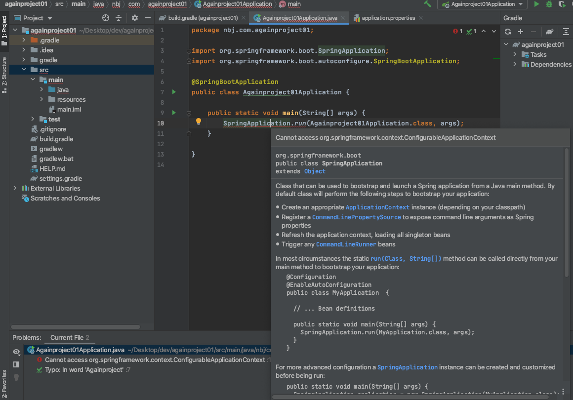 Spring Boot 프로젝트 생성시 메인함수에 다음과 같은 에러가 발생
