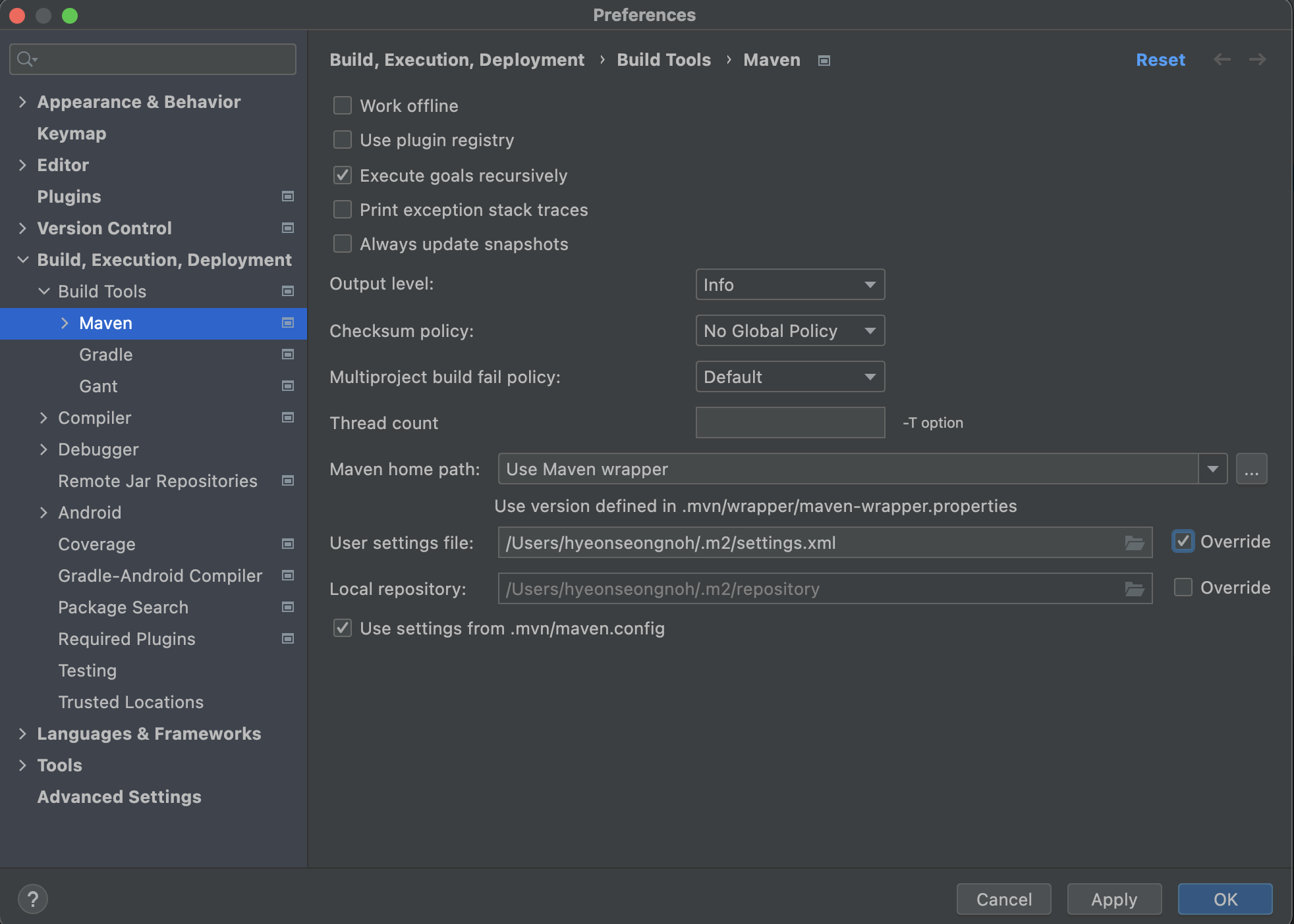 1. 아래 화면의 설정을 찾아 User settings file 의 오른쪽 Override를 체크해준다.